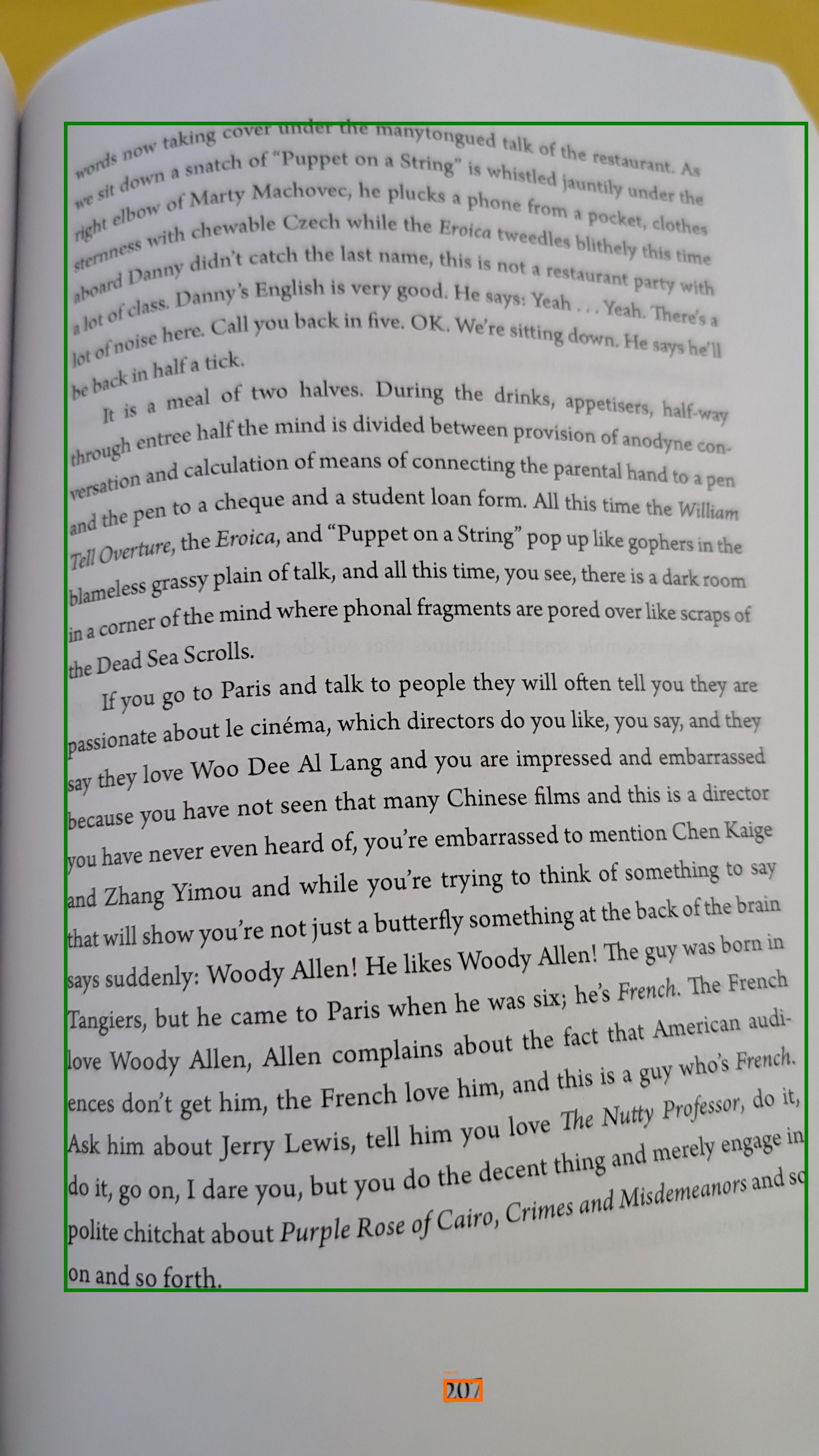 words now taking cover under the manytongued talk of the restaurant. As we sit down a snatch of "Puppet on a String" is whistled jauntily under the right elbow of Marty Machovec, he plucks a phone from a pocket, clothes sternness with chewable Czech while the Eroica tweedles blithely this time aboard Danny didn't catch the last name, this is not a restaurant party with a lot of class. Danny's English is very good. He says: Yeah... Yeah. Theres a be back in half a tick. lot of noise here. Call you back in five. OK. We're sitting down. He says he'll It is a meal of two halves. During the drinks, appetisers, half-way through entree half the mind is divided between provision of anodyne conversation and calculation of means of connecting the parental hand to a pen and the pen to a cheque and a student loan form. All this time the William Tell Overture, the Eroica, and "Puppet on a String" pop up like gophers in the blameless grassy plain of talk, and all this time, you see, there is a dark room in a corner of the mind where phonal fragments are pored over like scraps of the Dead Sea Scrolls.