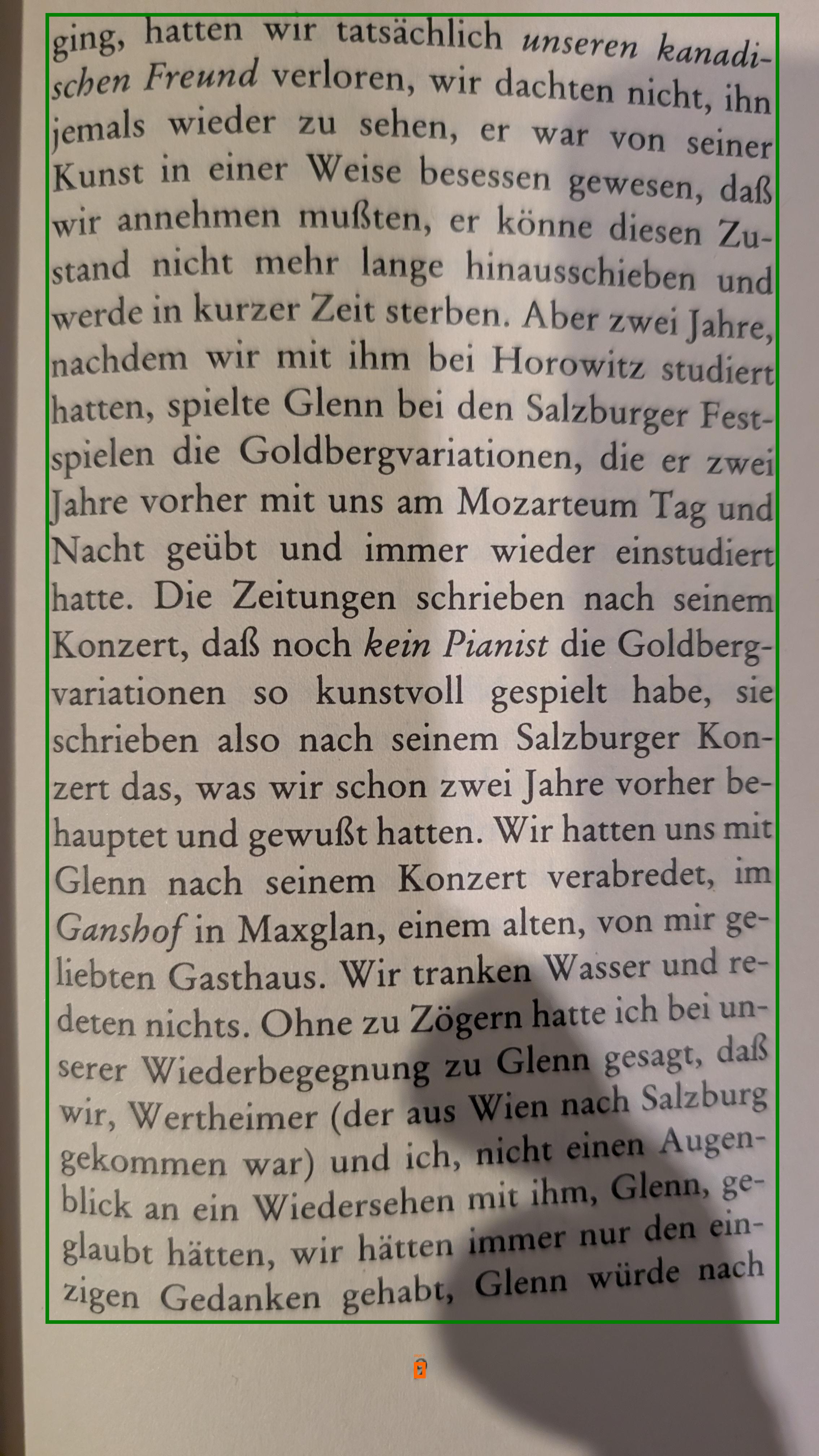 ging, hatten wir tatsächlich unseren kanadischen Freund verloren, wir dachten nicht, ihn jemals wieder zu sehen, er war von seiner Kunst in einer Weise besessen gewesen, daß wir annehmen mußten, er könne diesen Zustand nicht mehr lange hinausschieben und werde in kurzer Zeit sterben. Aber zwei Jahre, nachdem wir mit ihm bei Horowitz studiert hatten, spielte Glenn bei den Salzburger Festspielen die Goldbergvariationen, die er zwei Jahre vorher mit uns am Mozarteum Tag und Nacht geübt und immer wieder einstudiert hatte. Die Zeitungen schrieben nach seinem Konzert, daß noch kein Pianist die Goldbergvariationen so kunstvoll gespielt habe, sie schrieben also nach seinem Salzburger Konzert das, was wir schon zwei Jahre vorher behauptet und gewußt hatten. Wir hatten uns mit Glenn nach seinem Konzert verabredet, im Ganshof in Maxglan, einem alten, von mir geliebten Gasthaus. Wir tranken Wasser und redeten nichts. Ohne zu Zögern hatte ich bei unserer Wiederbegegnung zu Glenn gesagt, daß wir, Wertheimer (der aus Wien nach Salzburg gekommen war) und ich, nicht einen Augenblick an ein Wiedersehen mit ihm, Glenn, geglaubt hätten, wir hätten immer nur den einzigen Gedanken gehabt, Glenn würde nach