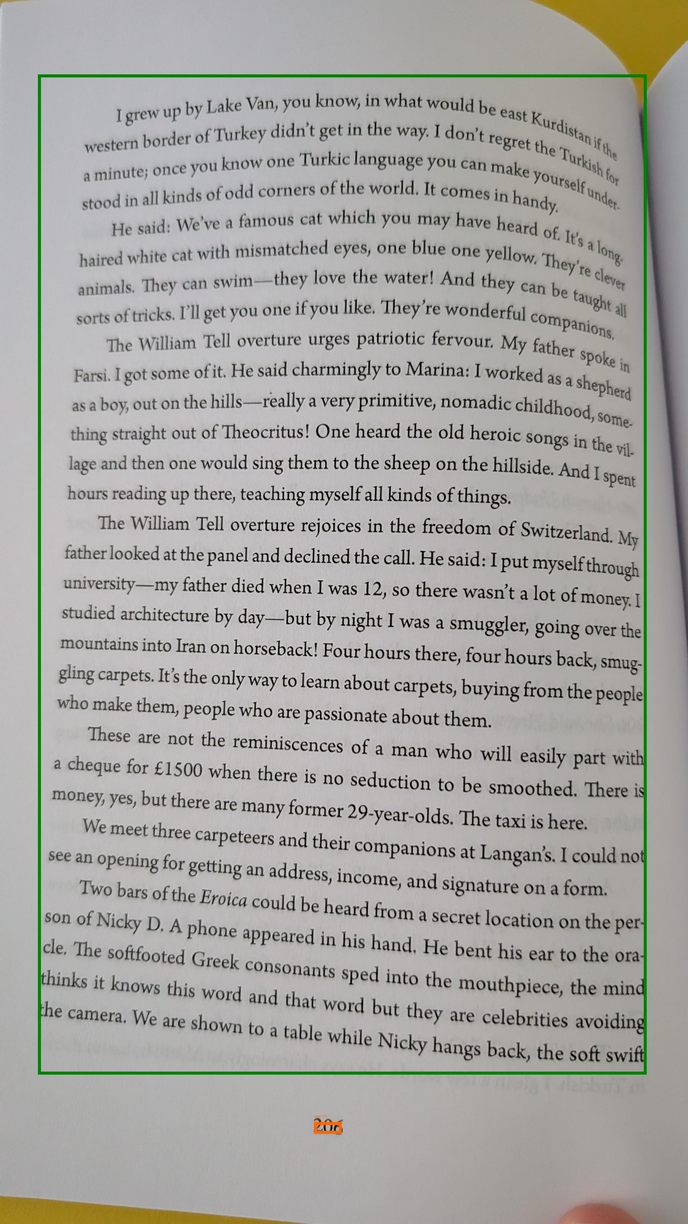 I grew up by Lake Van, you know, in what would be east Kurdistan if the western border of Turkey didn't get in the way. I don't regret the Turkish for a minute; once you know one Turkic language you can make yourself understood in all kinds of odd corners of the world. It comes in handy. He said: We've a famous cat which you may have heard of. It's a long-haired white cat with mismatched eyes, one blue one yellow. They're clever animals. They can swim—they love the water! And they can be taught all sorts of tricks. I'll get you one if you like. They're wonderful companions. The William Tell overture urges patriotic fervour. My father spoke in Farsi. I got some of it. He said charmingly to Marina: I worked as a shepherd as a boy, out on the hills—really a very primitive, nomadic childhood, something straight out of Theocritus! One heard the old heroic songs in the village and then one would sing them to the sheep on the hillside. And I spent hours reading up there, teaching myself all kinds of things. The William Tell overture rejoices in the freedom of Switzerland. My father looked at the panel and declined the call. He said: I put myself through university—my father died when I was 12, so there wasn't a lot of money. I studied architecture by day—but by night I was a smuggler, going over the mountains into Iran on horseback! Four hours there, four hours back, smuggling carpets. It's the only way to learn about carpets, buying from the people who make them, people who are passionate about them. These are not the reminiscences of a man who will easily part with a cheque for £1500 when there is no seduction to be smoothed. There is money, yes, but there are many former 29-year-olds. The taxi is here. We meet three carpeteers and their companions at Langan's. I could not see an opening for getting an address, income, and signature on a form. Two bars of the Eroica could be heard from a secret location on the person of Nicky D. A phone appeared in his hand. He bent his ear to the oracle. The softfooted Greek consonants sped into the mouthpiece, the mind thinks it knows this word and that word but they are celebrities avoiding the camera. We are shown to a table while Nicky hangs back, the soft swift