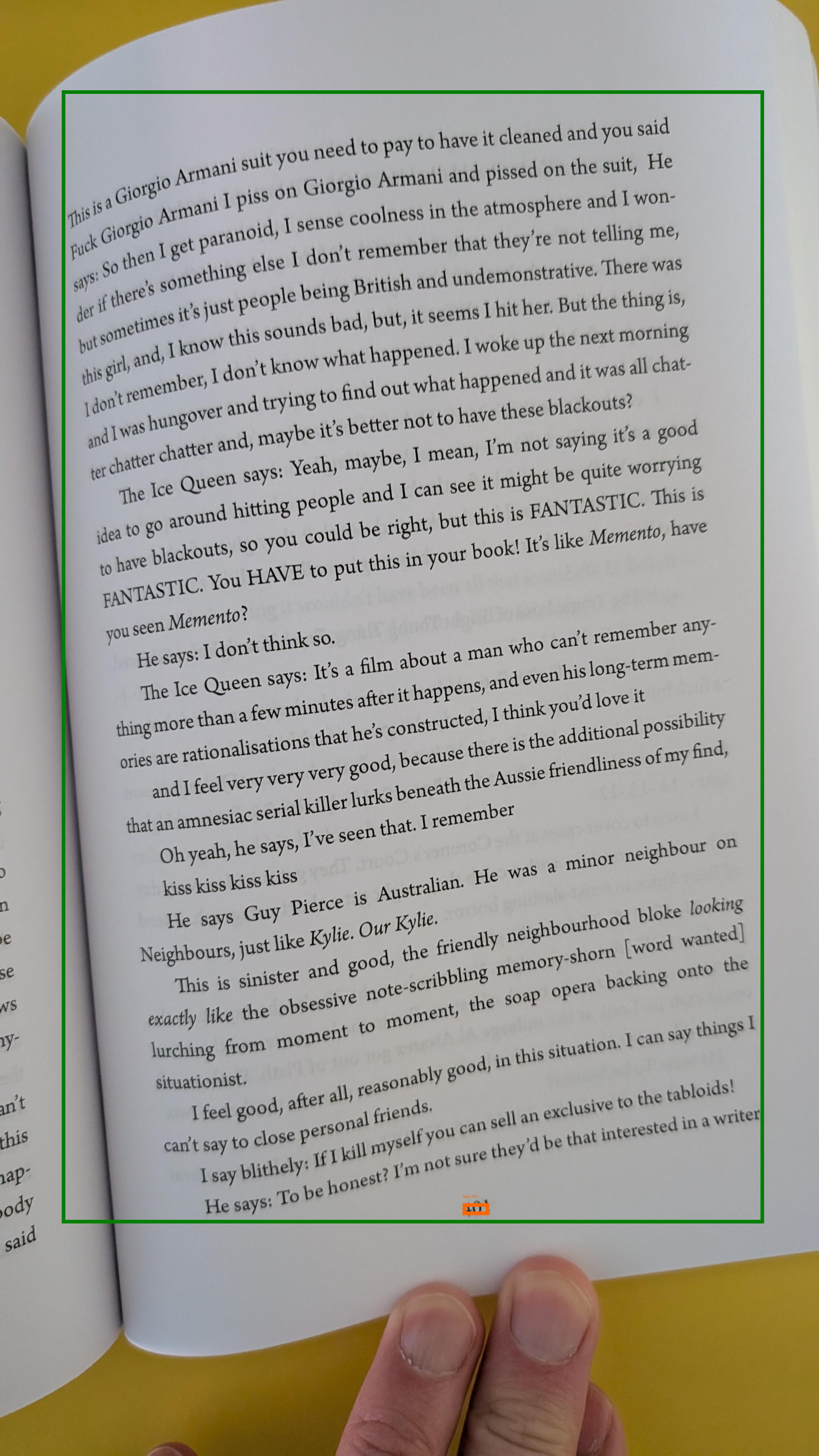 This is a Giorgio Armani suit you need to pay to have it cleaned and you said Fuck Giorgio Armani I piss on Giorgio Armani and pissed on the suit, He says: So then I get paranoid, I sense coolness in the atmosphere and I wonder if there's something else I don't remember that they're not telling me, but sometimes it's just people being British and undemonstrative. There was this girl, and, I know this sounds bad, but, it seems I hit her. But the thing is, Idon't remember, I don't know what happened. I woke up the next morning and I was hungover and trying to find out what happened and it was all chatter chatter chatter and, maybe it's better not to have these blackouts? The Ice Queen says: Yeah, maybe, I mean, I'm not saying it's a good idea to go around hitting people and I can see it might be quite worrying to have blackouts, so you could be right, but this is FANTASTIC. This is FANTASTIC. You HAVE to put this in your book! It's like Memento, have you seen Memento? He says: I don't think so. The Ice Queen says: It's a film about a man who can't remember anything more than a few minutes after it happens, and even his long-term memories are rationalisations that he's constructed, I think you'd love it and I feel very very very good, because there is the additional possibility that an amnesiac serial killer lurks beneath the Aussie friendliness of my find, Oh yeah, he says, I've seen that. I remember kiss kiss kiss kiss He says Guy Pierce is Australian. He was a minor neighbour on Neighbours, just like Kylie. Our Kylie. This is sinister and good, the friendly neighbourhood bloke looking exactly like the obsessive note-scribbling memory-shorn [word wanted] Lurching from moment to moment, the soap opera backing onto the situationist. I feel good, after all, reasonably good, in this situation. I can say things I can't say to close personal friends. I say blithely: IfI kill myself you can sell an exclusive to the tabloids! He says: To be honest? I'm not sure they'd be that interested in a writer.