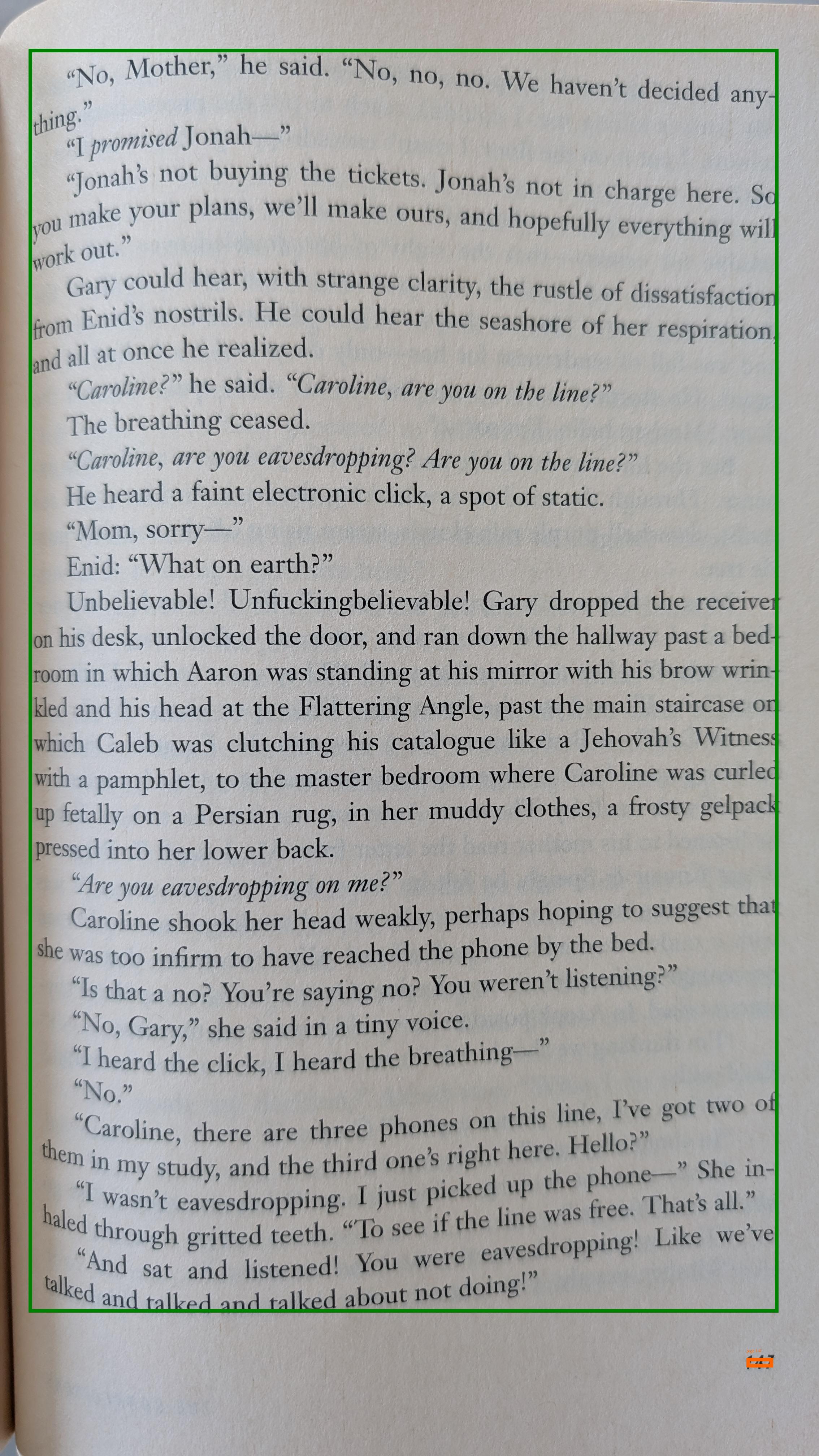 "No, Mother," he said. "No, no, no. We haven't decided anything." "I promised Jonah—" "Jonah's not buying the tickets. Jonah's not in charge here. So you make your plans, we'll make ours, and hopefully everything will work out." Gary could hear, with strange clarity, the rustle of dissatisfaction from Enid's nostrils. He could hear the seashore of her respiration, and all at once he realized. "Caroline?" he said. "Caroline, are you on the line?" The breathing ceased. "Caroline, are you eavesdropping? Are you on the line?" He heard a faint electronic click, a spot of static. "Mom, sorry—" Enid: "What on earth?" Unbelievable! Unfuckingbelievable! Gary dropped the receiver on his desk, unlocked the door, and ran down the hallway past a bedroom in which Aaron was standing at his mirror with his brow wrinkled and his head at the Flattering Angle, past the main staircase on which Caleb was clutching his catalogue like a Jehovah's Witness with a pamphlet, to the master bedroom where Caroline was curled up fetally on a Persian rug, in her muddy clothes, a frosty gelpack pressed into her lower back. "Are you eavesdropping on me?" Caroline shook her head weakly, perhaps hoping to suggest that she was too infirm to have reached the phone by the bed. "Is that a no? You're saying no? You weren't listening?" "No, Gary," she said in a tiny voice. "I heard the click, I heard the breathing—" "No." "Caroline, there are three phones on this line, I've got two of them in my study, and the third one's right here. Hello?" "I wasn't eavesdropping. I just picked up the phone—" She inhaled through gritted teeth. "To see if the line was free. That's all." "And sat and listened! You were eavesdropping!' Like we've talked and talked and talked about not doing!"